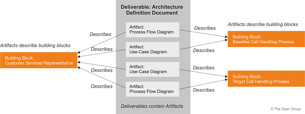 For example, an Architecture Definition Document is a deliverable that documents an Architecture Description. This document will contain a number of complementary artifacts that are views of the building blocks relevant to the architecture. For example, a process flow diagram (an artifact) may be created to describe the target call handling process (a building block). This artifact may also describe other building blocks, such as the actors involved in the process (e.g., a Customer Services Representative). An example of the relationships between deliverables, artifacts, and building blocks is illustrated in Figure 2-2 .