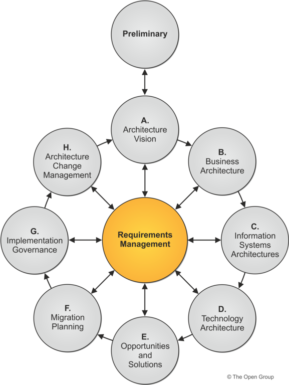 It is important to note that the Requirements Management circle denotes not a static set of requirements, but a dynamic process whereby requirements for Enterprise Architecture and subsequent changes to those requirements are identified, stored, and fed into and out of the relevant ADM phases, and also between cycles of the ADM.
